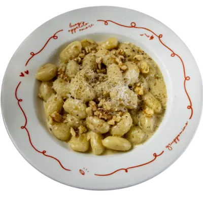 Des gnocchi dorés à la poêle, dans la sauce Mimo, enrobés de beurre parfumé à la sauge, avec une sauce crémeuse aux fromages italiens : taleggio, gorgonzola, parmesan,noix et pecorino