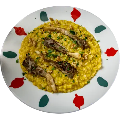 Risotto crémeux au velouté de courge, pleurotes, noix et persil